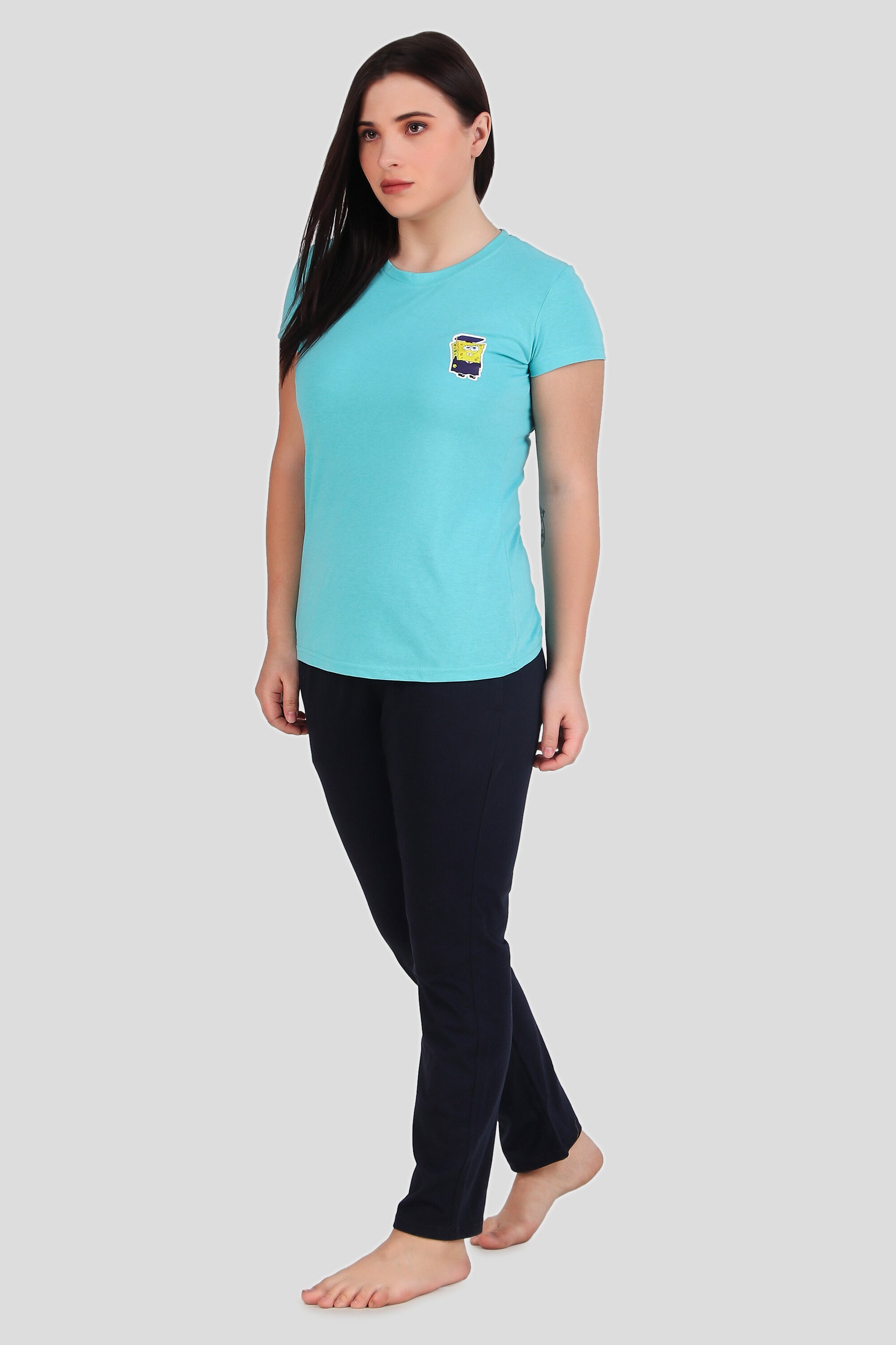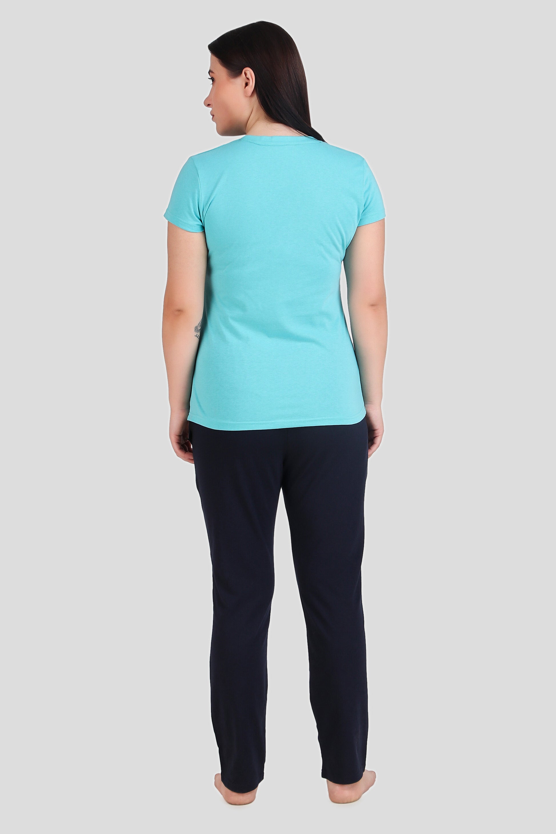his elegant night suit features a woman wearing a comfortable blue t-shirt paired with sleek Dark Blue lower. The t-shirt is crafted from soft, breathable fabric, ensuring a cozy and relaxing fit for a good night's sleep. The blue pants provide a stylish contrast to the blue top, creating a chic and modern look perfect for lounging at home or getting a restful night's sleep.